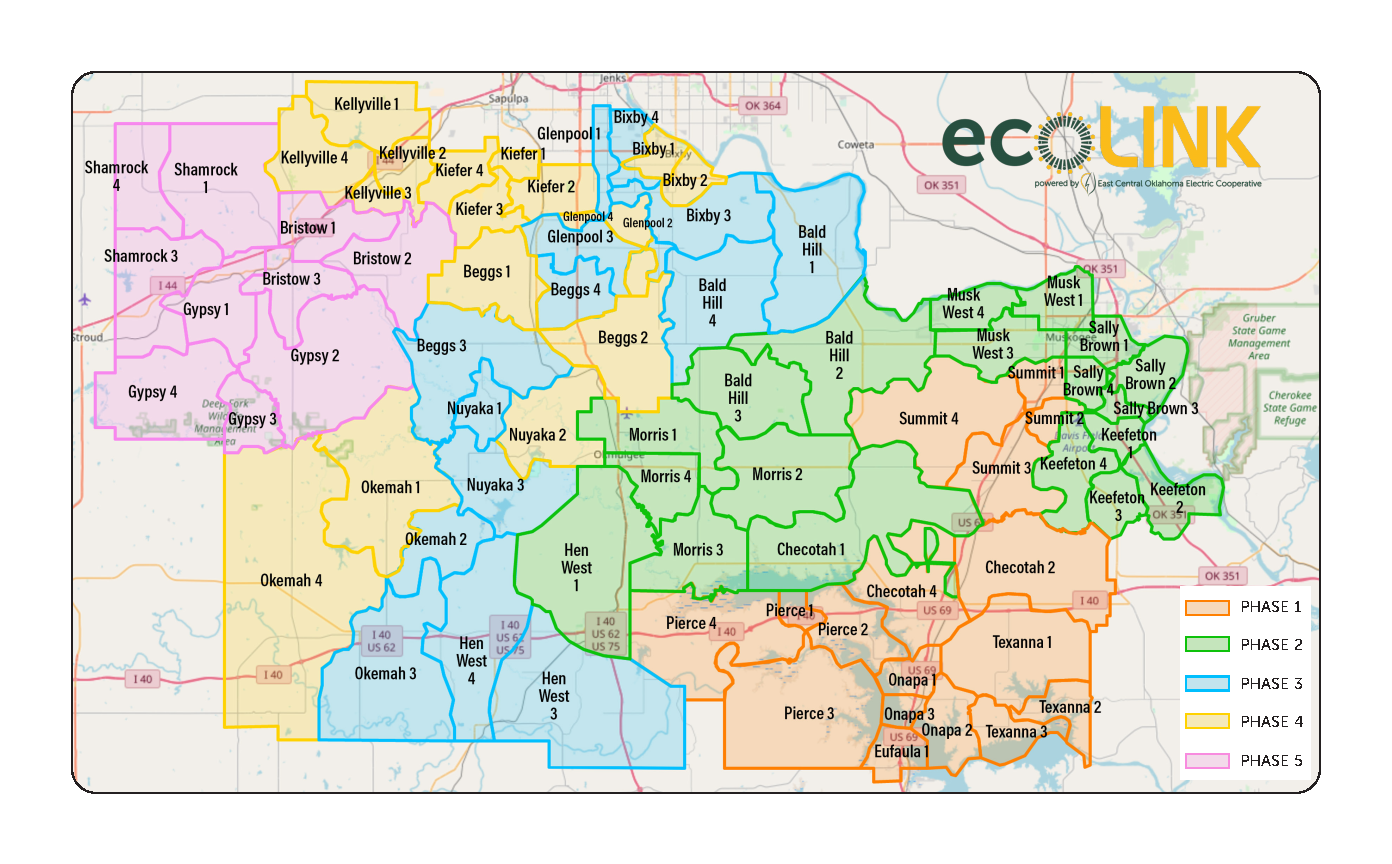 The project is being built out in five phases. The map below details both the phases, and the electrical feeders to which our members are connected.